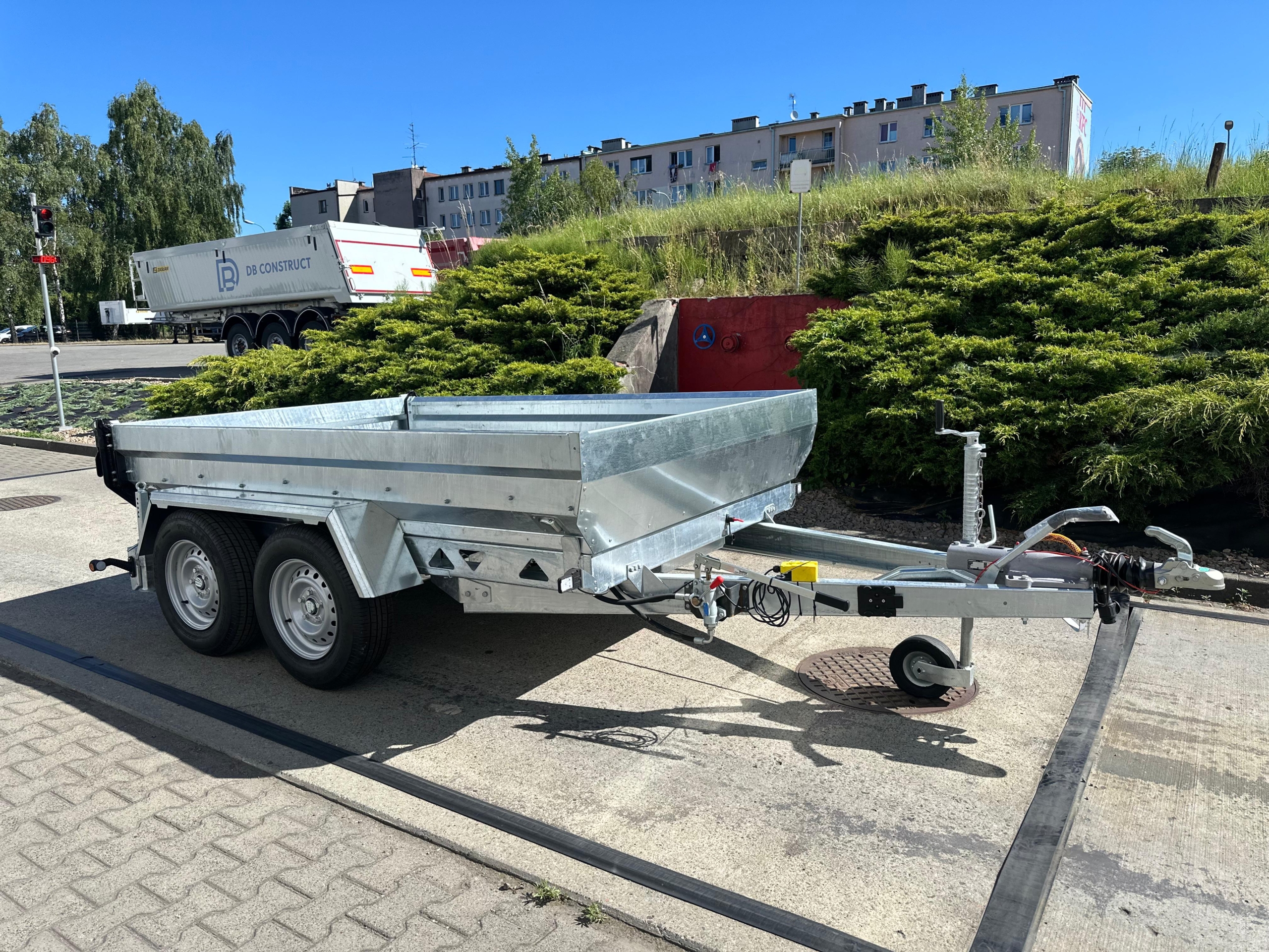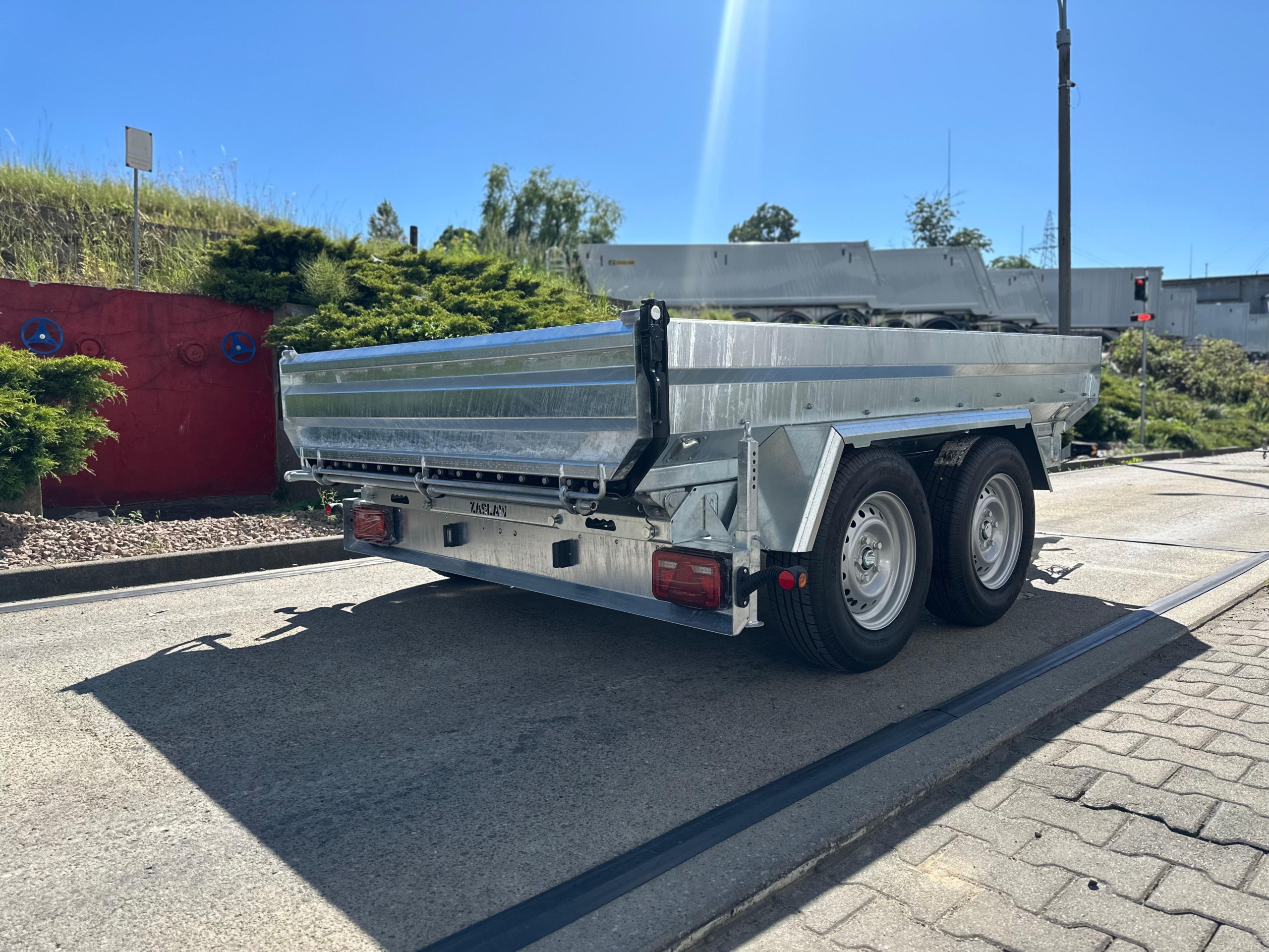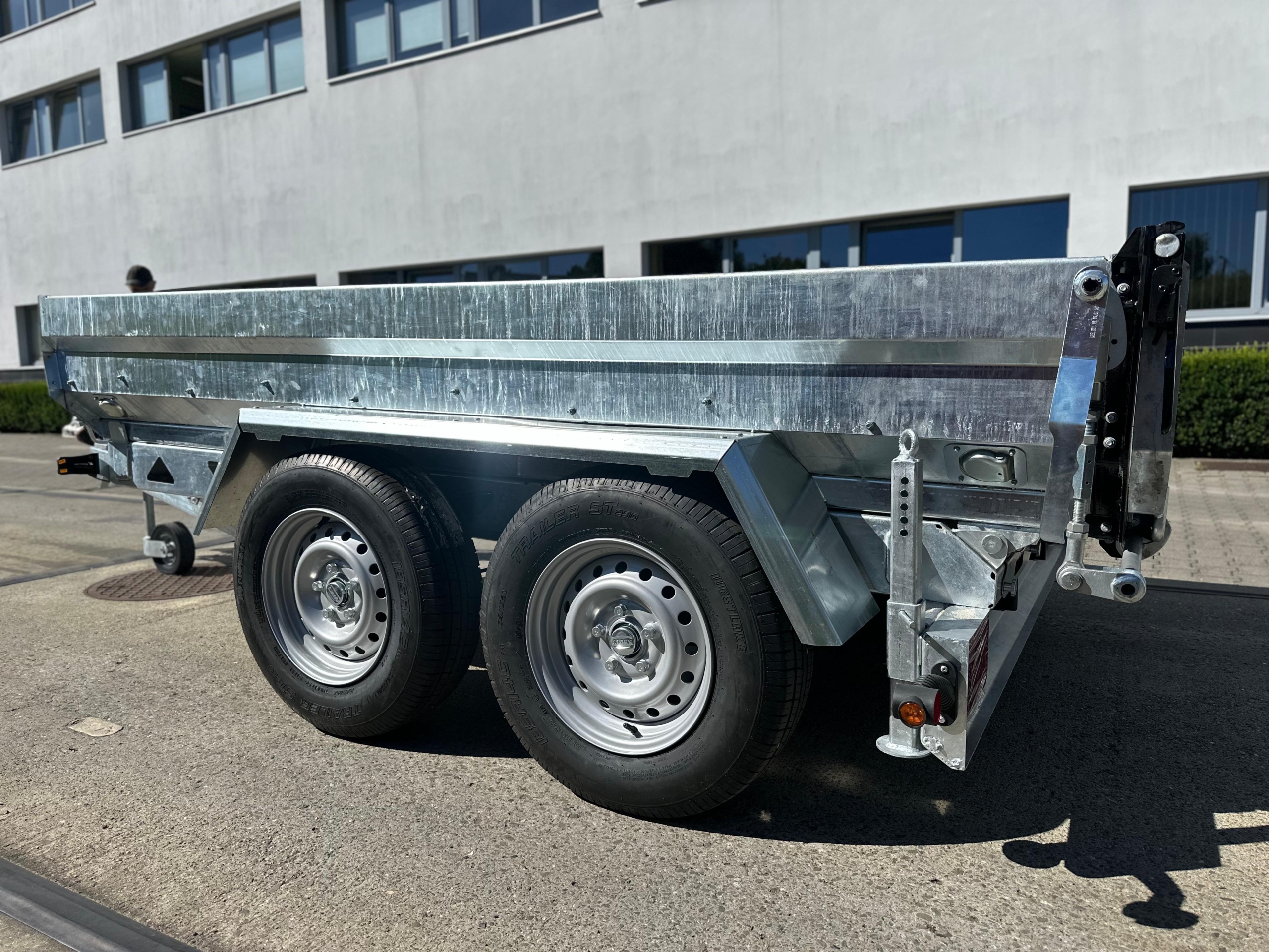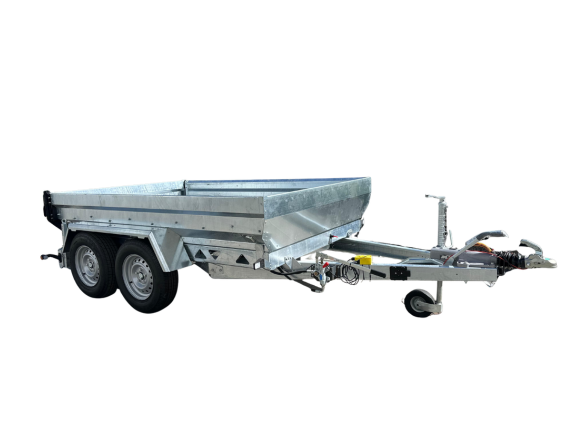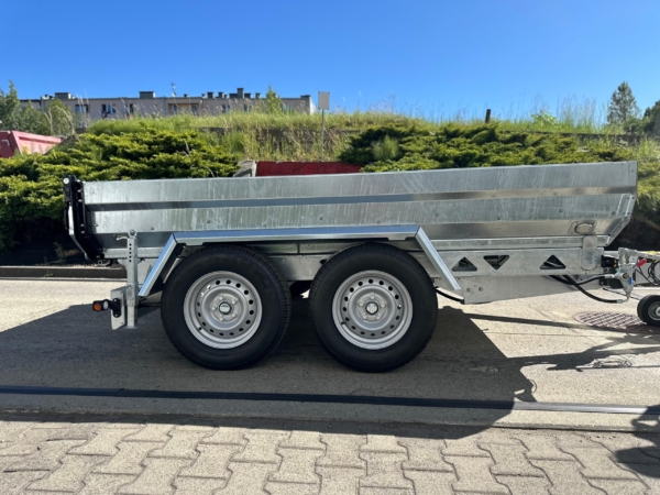 Przyczepa kiprowana WT350TH – Wywrotka to idealne rozwiązanie dla rozładunku towarów sypkich. Wywrót do tyłu na siłowniku hydraulicznym wspomagany pompami elektryczną lub ręczną umożliwią szybkie i precyzyjne wyładowanie towaru. Rama przyczepy stalowa ocynkowana ze stali konstrukcyjnej o podwyższonej wytrzymałość. Podłoga grubość 3 mm, burty oraz ściana przodu grubość 2 mm.