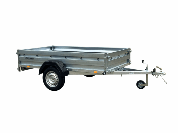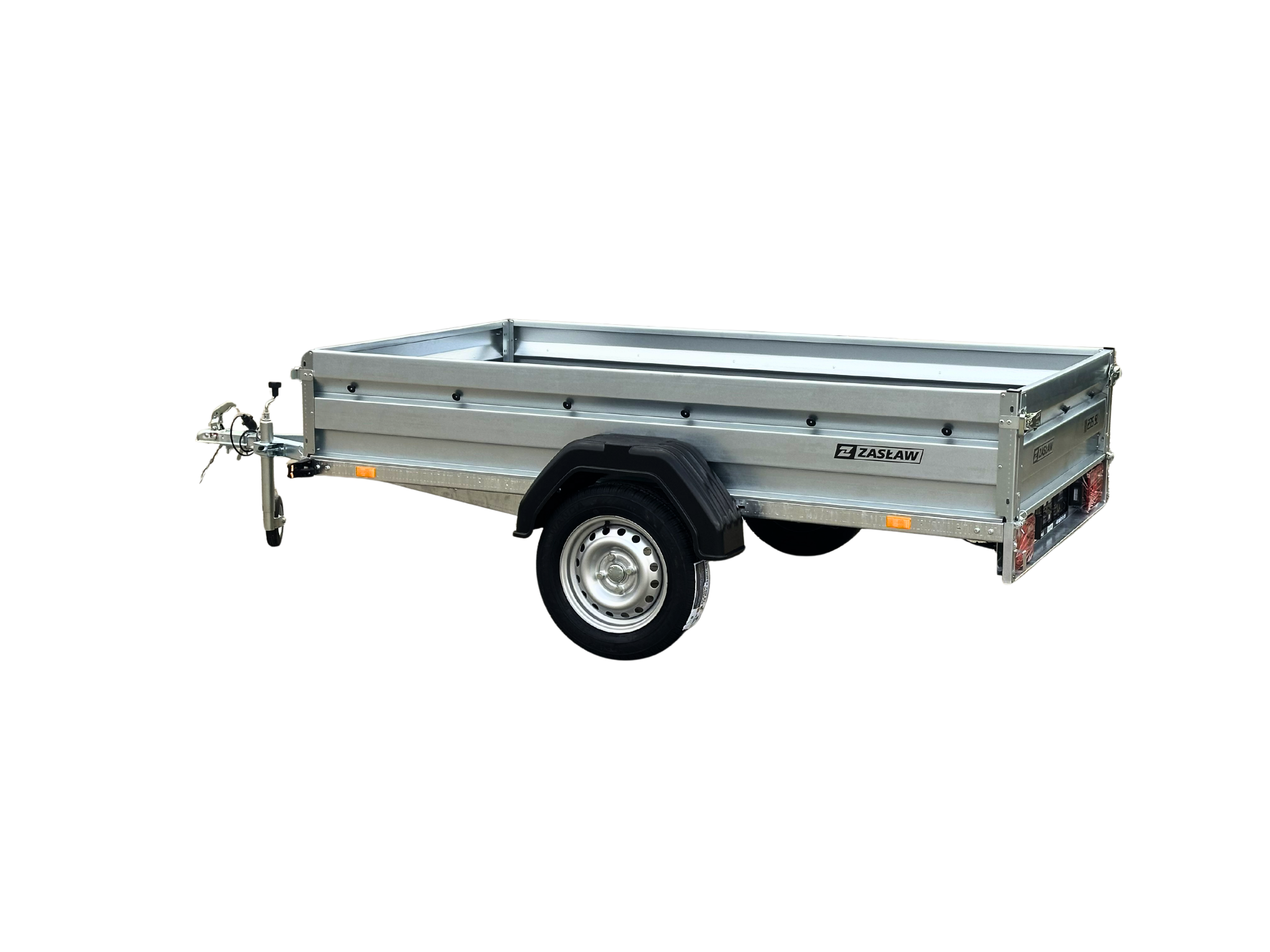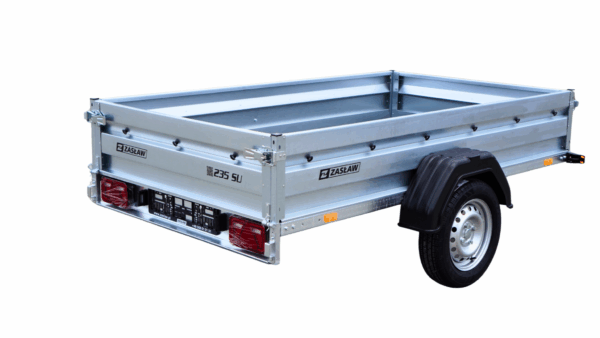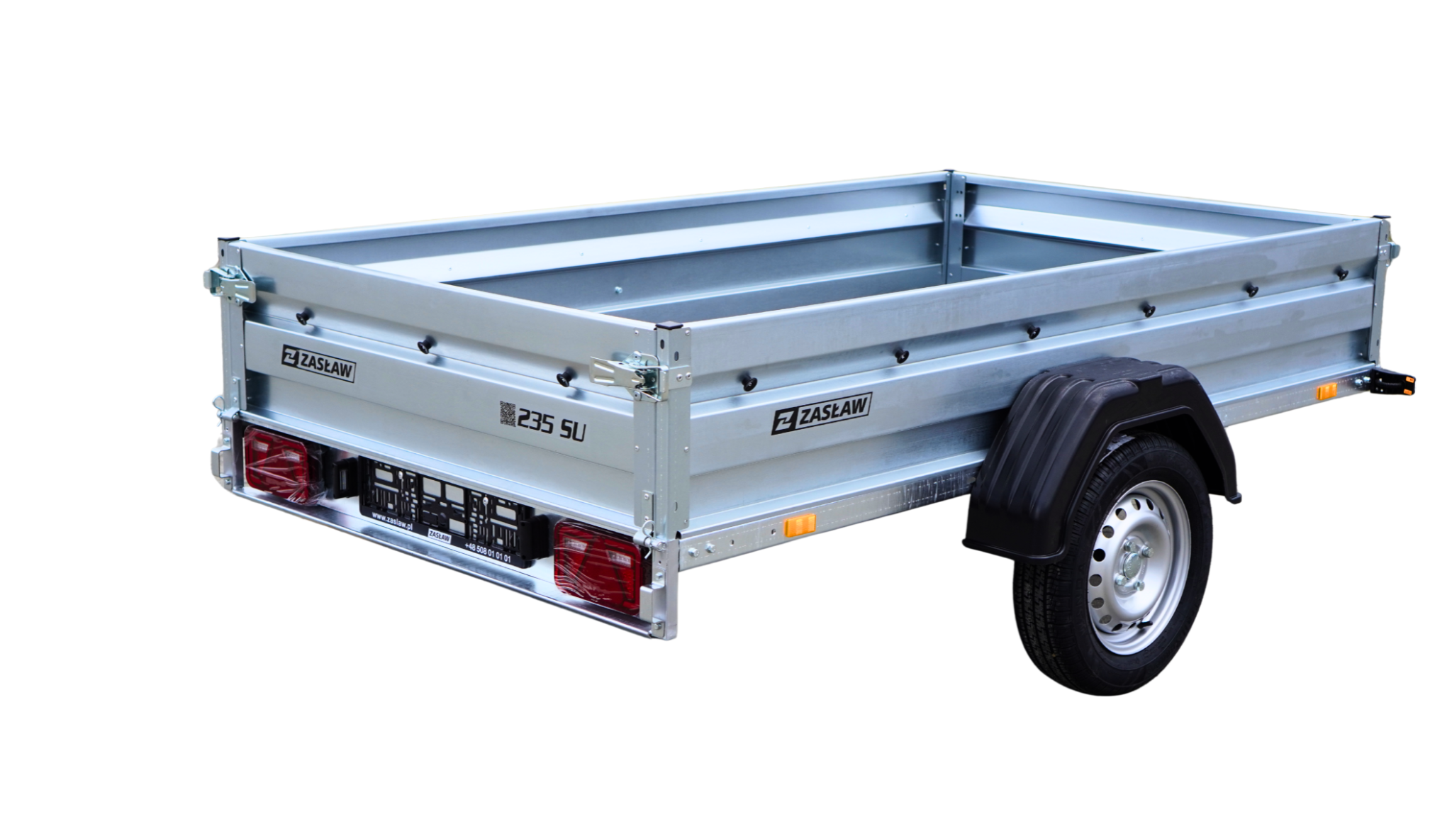 Przyczepy towarowe Zasław to nowoczesna linia przyczep samochodowych wykonanych z najlepszych dostępnych na polskim rynku materiałów. Produkty tej kategorii charakteryzuje m.in.: nowoczesny design burt walcowanych na zimno, wytrzymałe zaczepy burtowe z kompensacją oraz dyszel prowadzony od osi dla większej wytrzymałości konstrukcji. Wszystkie elementy ramy cynkowane są ogniowo, co gwarantuje ich trwałość i dużą odporność na korozję. Model 235SU posiada dodadkowko: oś o DMC 750kg, uchylną skrzynię i otwieraną przednią burtę oraz system szybkiego demontażu burt. Wyposażony jest także w: koło podporowe z obejmą oraz uchwyty mocujące towar jak również ramkę tablicy rejestracyjnej.